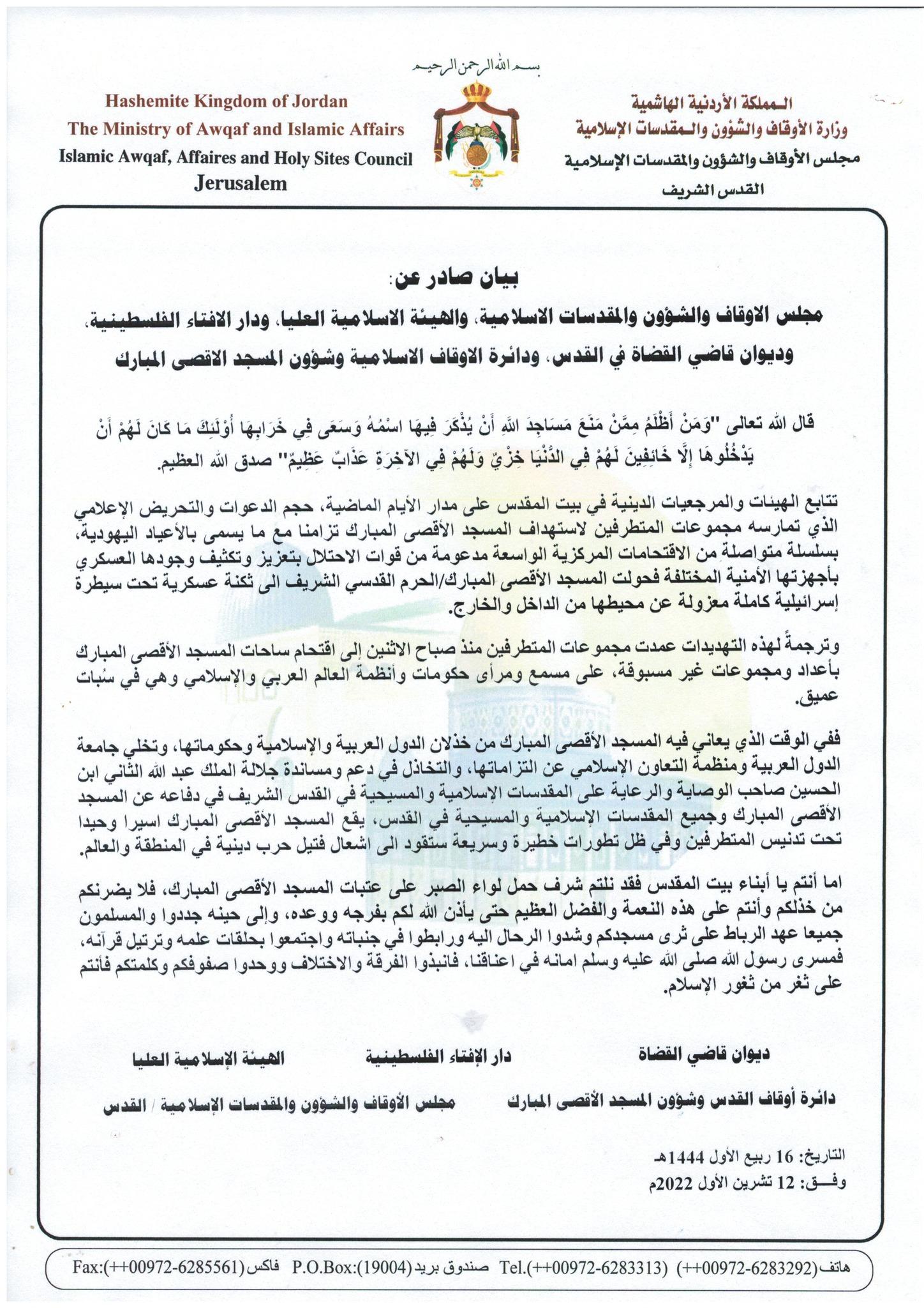 ففي الوقت الذي يعاني فيه المسجد الأقصى المبارك من خذلان الدول العربية والإسلامية وحكوماتها، وتخلي جامعة الدول العربية ومنظمة التعاون الإسلامي عن التزاماتها، والتخاذل في دعم ومساندة جلالة الملك عبد الله الثاني ابن الحسين صاحب الوصاية والرعاية على المقدسات الإسلامية والمسيحية في القدس الشريف في دفاعه عن المسجد الأقصى المبارك وجميع المقدسات الإسلامية والمسيحية في القدس، يقع المسجد الأقصى المبارك اسيرا وحيدا تحت تدنيس المتطرفين وفي ظل تطورات خطيرة وسريعة ستقود الى اشعال فتيل حرب دينية في المنطقة والعالم.