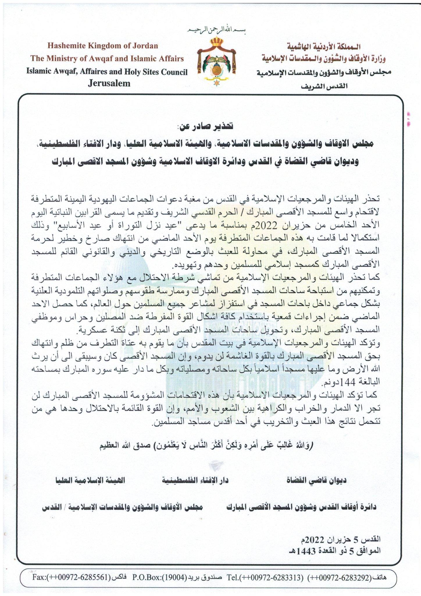 تحذر الهيئات والمرجعيات الإسلامية في القدس من مغبة دعوات الجماعات اليهودية اليمينة المتطرفة لاقتحام واسع للمسجد الأقصى المبارك / الحرم القدسي الشريف وتقديم ما يسمى القرابين النباتية اليوم الأحد الخامس من حزيران 2022م بمناسبة ما يدعى "عيد نزل التوراة أو عيد الأسابيع" وذلك استكمالا لما قامت به هذه الجماعات المتطرفة يوم الأحد الماضي من انتهاك صارخ وخطير لحرمة المسجد الأقصى المبارك، في محاولة للعبث بالوضع التاريخي والديني والقانوني القائم للمسجد الأقصى المبارك كمسجد إسلامي للمسلمين وحدهم وتهويده.