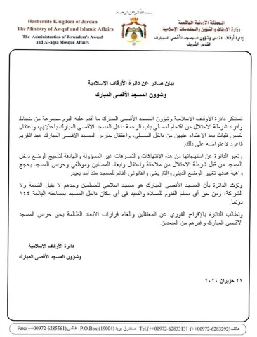 بيان صادر عن دائرة الأوقاف الإسلامية وشؤون المسجد الأقصى المبارك 21 حزيران 2020
