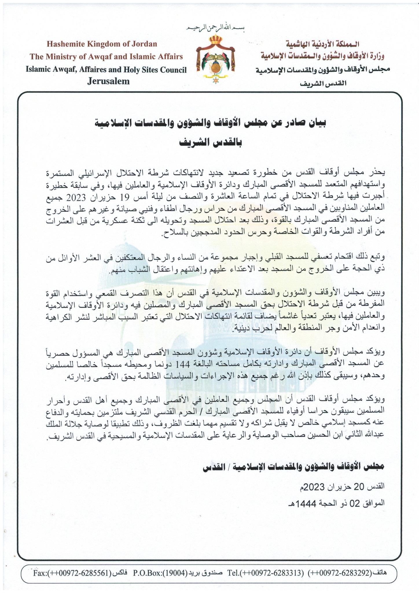 يحذر مجلس أوقاف القدس من خطورة تصعيد جديد لانتهاكات شرطة الاحتلال الإسرائيلي المستمرة واستهدافهم المتعمد للمسجد الأقصى المبارك ودائرة الأوقاف الإسلامية والعاملين فيها، وفي سابقة خطيرة أجبرت فيها شرطة الاحتلال في تمام الساعة العاشرة والنصف من ليلة أمس 19 حزيران 2023 جميع العاملين المناوبين في المسجد الأقصى المبارك من حراس ورجال اطفاء وفنيي صيانة وغيرهم على الخروج من المسجد الأقصى المبارك بالقوة، وذلك بعد احتلال المسجد وتحويله الى ثكنة عسكرية من قبل العشرات من أفراد الشرطة والقوات الخاصة وحرس الحدود المدججين بالسلاح.