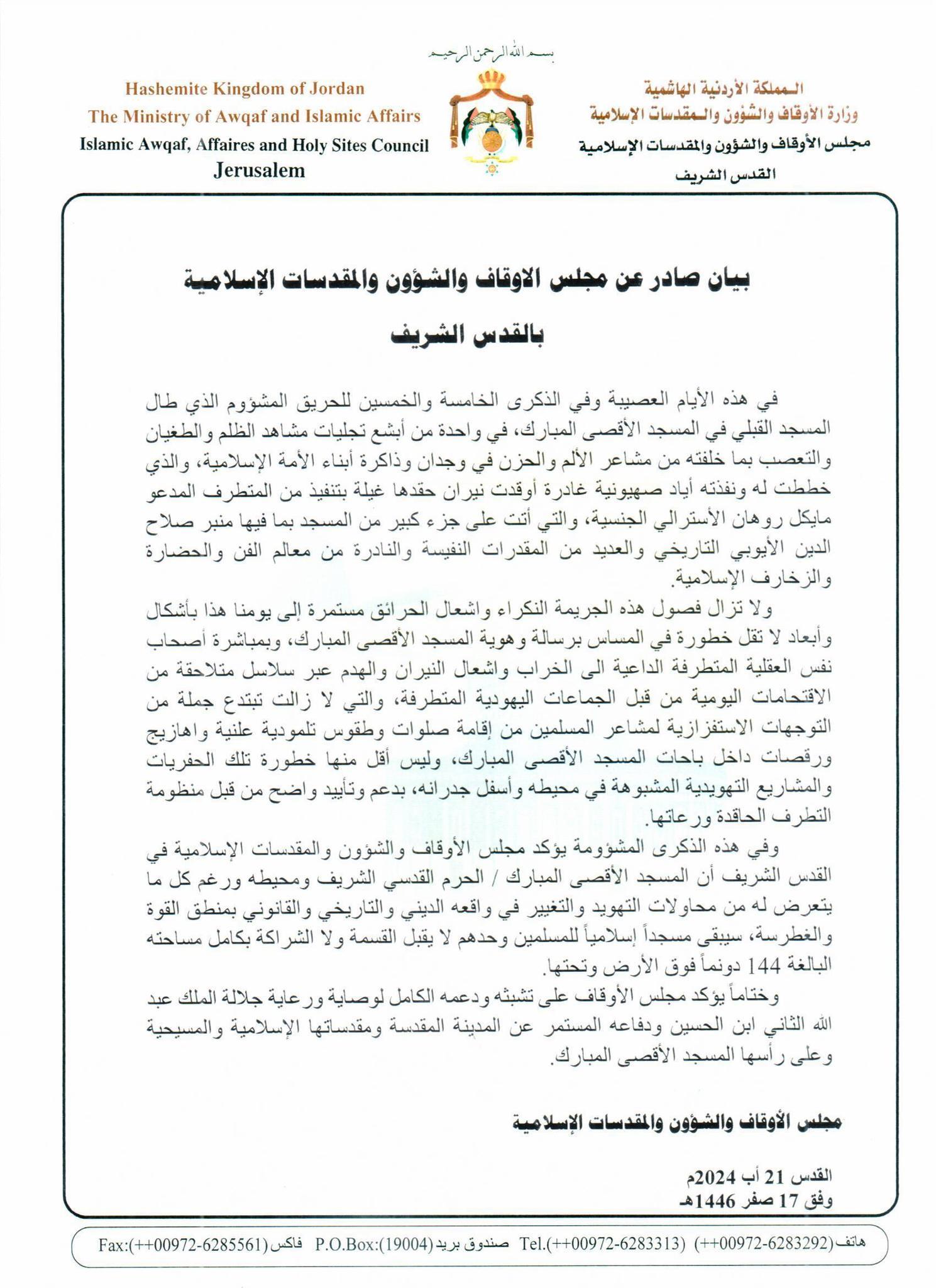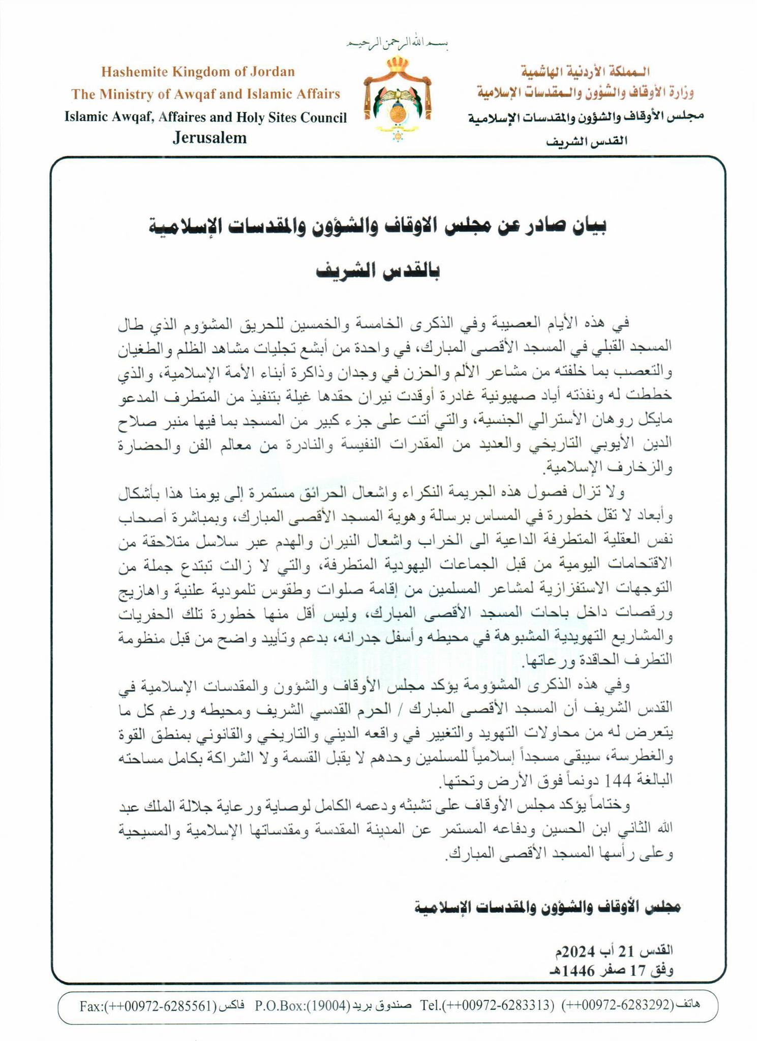 بيان صادر عن مجلس الاوقاف والشؤون والمقدسات الإسلامية- 17 صفر 1446هـ