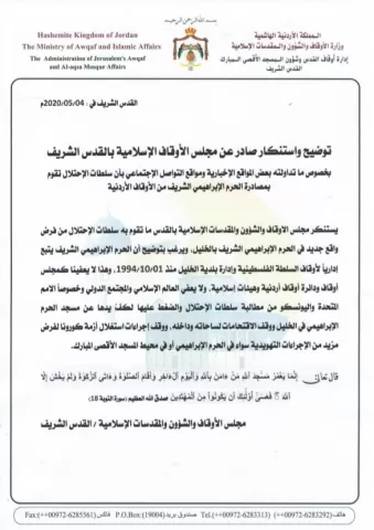 بخصوص ما تداولته بعض المواقع الإخبارية ومواقع التواصل الاجتماعي بأن سلطات الاحتلال تقوم بمصادرة الحرم الإبراهيمي الشريف من الأوقاف الأردنية
