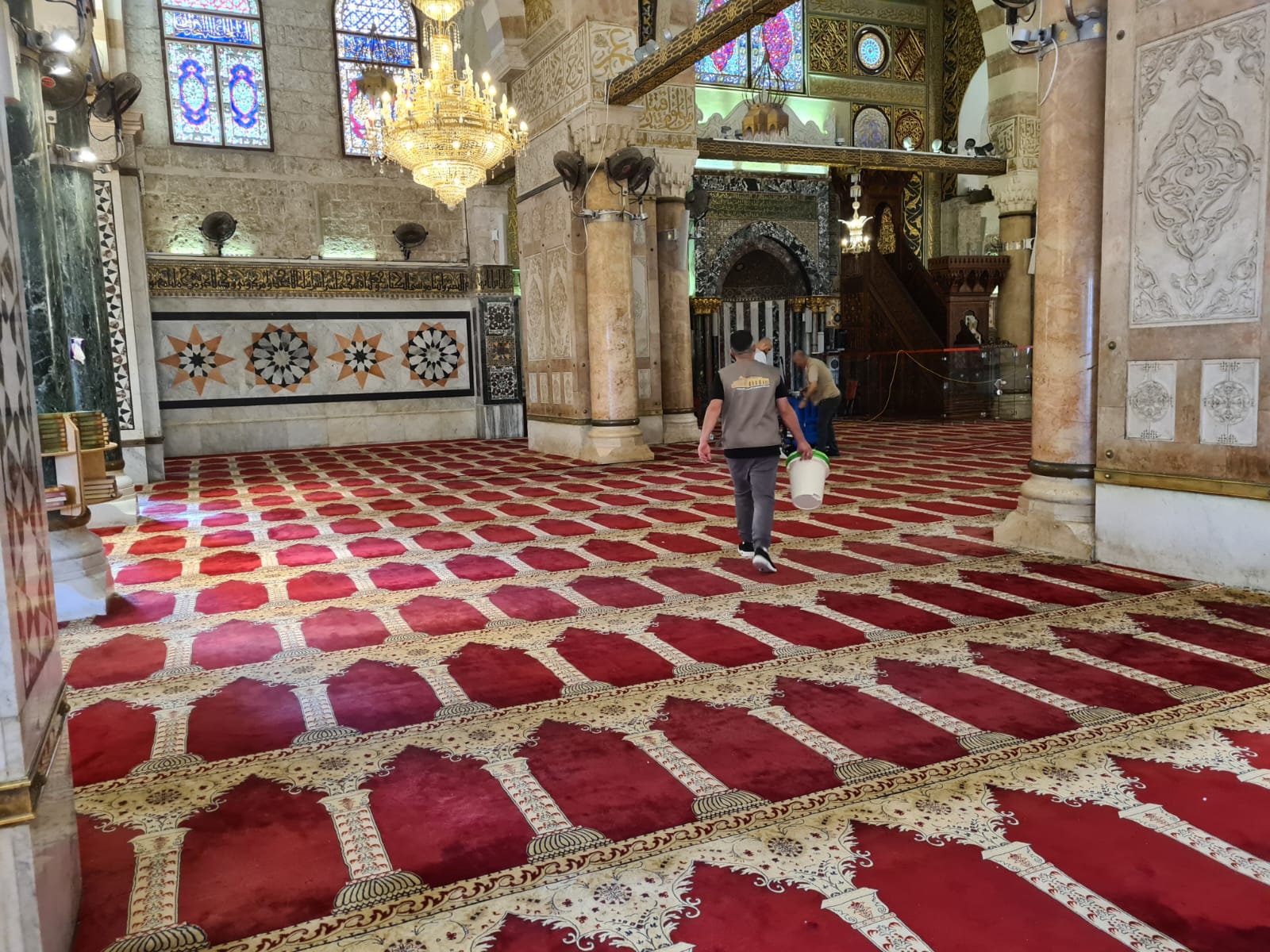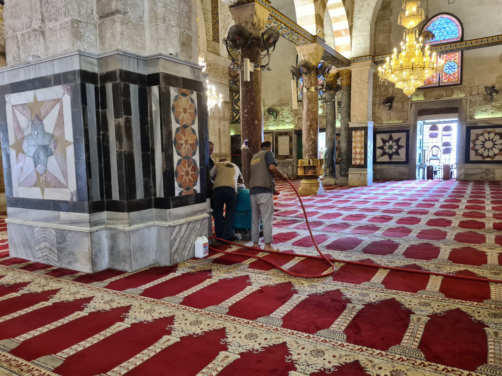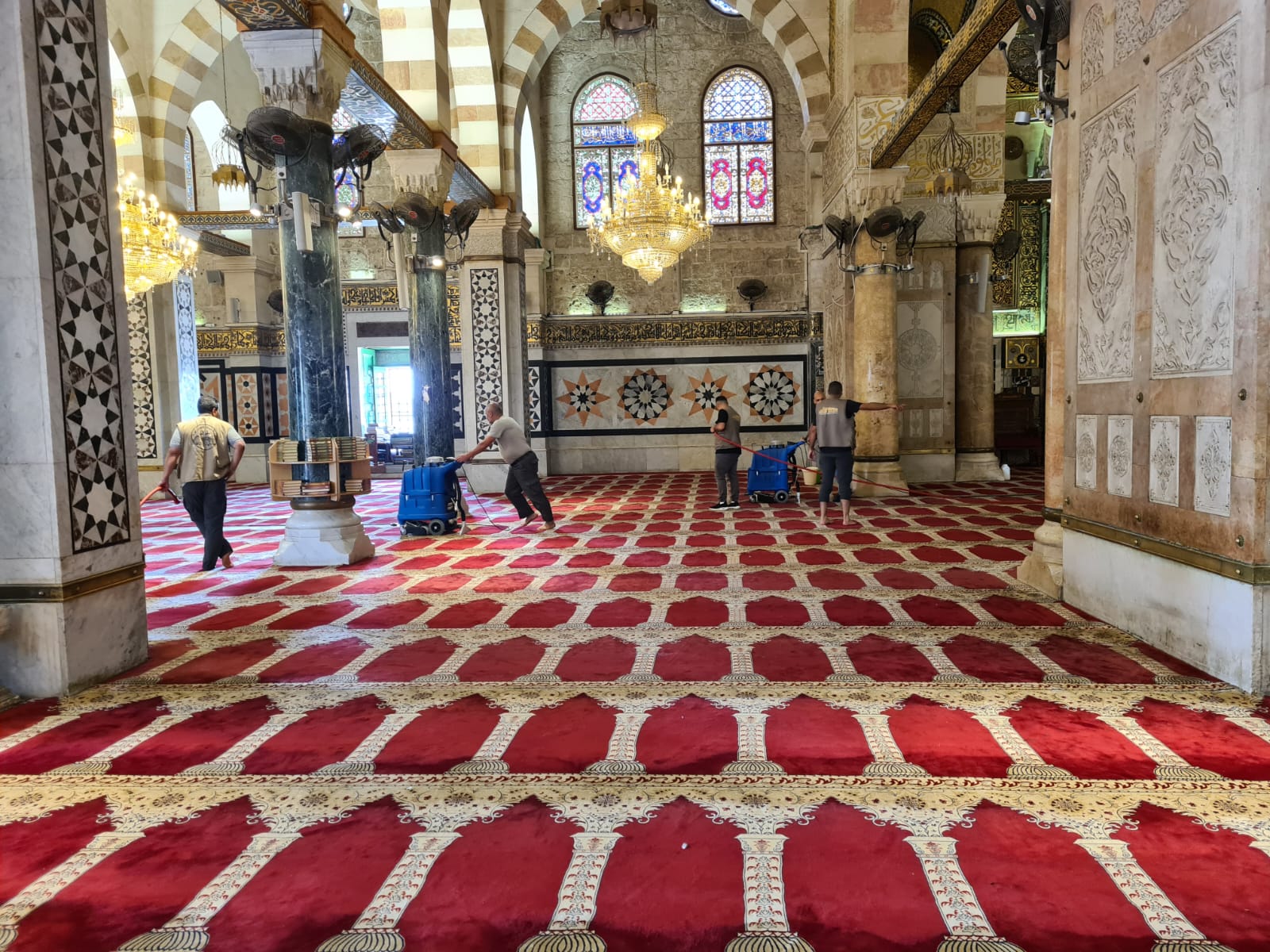 جانب من عمل موظفي قسم السدنة التابع لدائرة الأوقاف الإسلامية وشؤون المسجد الأقصى المبارك على تنظيف سجاد المصلى القبلي منذ ساعات صباح اليوم، وذلك بعد انقضاء شهر رمضان المبارك وعيد الفطر وعيد الأضحى، باستخدام آلات حديثة ومتطورة لعملية التنظيف إضافة الى مواد تنظيف وتعقيم خاصة.