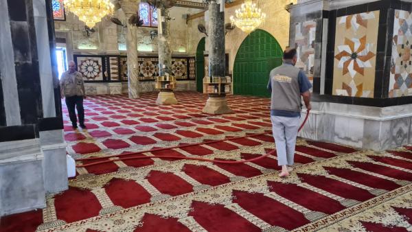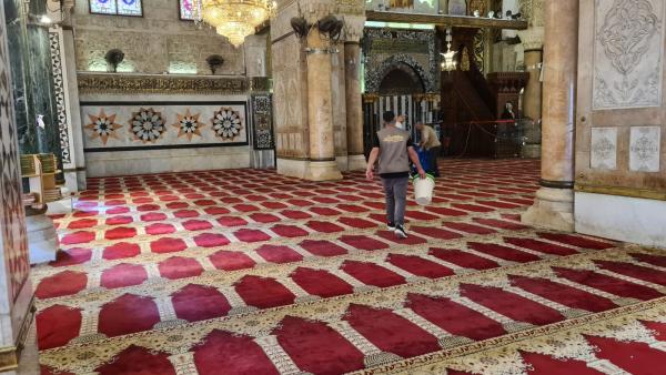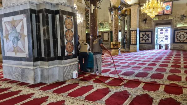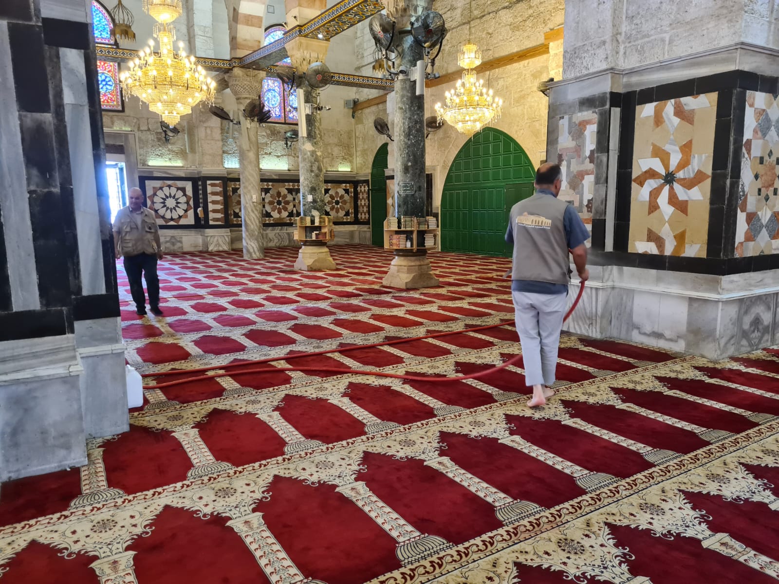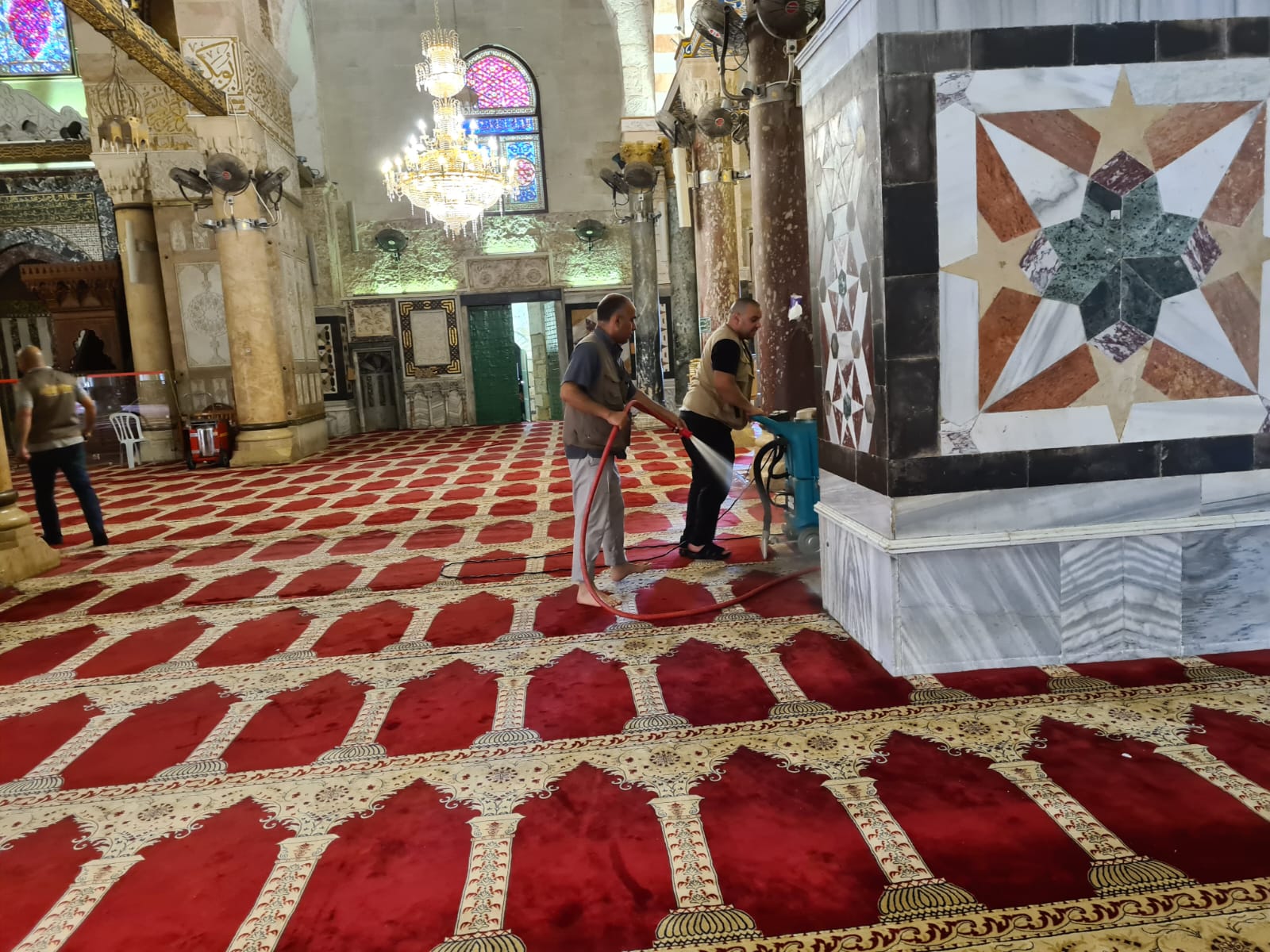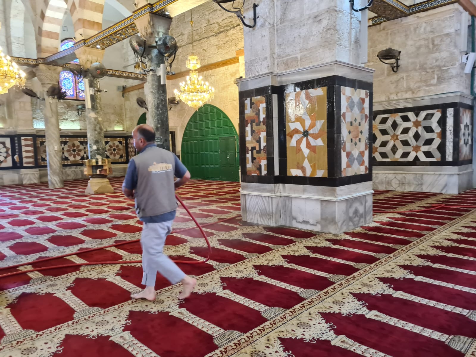 جانب من عمل موظفي قسم السدنة التابع لدائرة الأوقاف الإسلامية وشؤون المسجد الأقصى المبارك على تنظيف سجاد المصلى القبلي منذ ساعات صباح اليوم، وذلك بعد انقضاء شهر رمضان المبارك وعيد الفطر وعيد الأضحى، باستخدام آلات حديثة ومتطورة لعملية التنظيف إضافة الى مواد تنظيف وتعقيم خاصة.